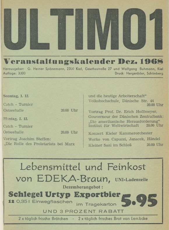 Stadtmagazine als Inspirationsquelle fĂŒr mobile, aktive und erlebnishungrige Menschen gehören heute zu jeder gröĂeren Stadt - in bewusster ErgĂ€nzung zur Tageszeitung. Das erste deutsche Stadtmagazin ultimo wurde bereits 1968 In Kiel von den Studenten Wolfgang Buhmann und G. Heiner Spönemann gegrĂŒndet. Nach gemeinsamen SchĂŒlerzeitungszeiten verabredeten sie in der legendĂ€ren Szenekneipe âclub 68â (in der RingstraĂe 68) einen Veranstaltungskalender fĂŒr die Stadt, finanziert aus Anzeigen, zur kostenlosen Abgabe in einer Startauflage von 3000 Exemplaren zu produzieren. Im handlichen Format DIN A 5 umfasste die erste Ausgabe im Dezember 1968 lediglich sechs Seiten. Bei der monatlichen Erscheinungsweise bot sich der Name âultimoâ einfach an.