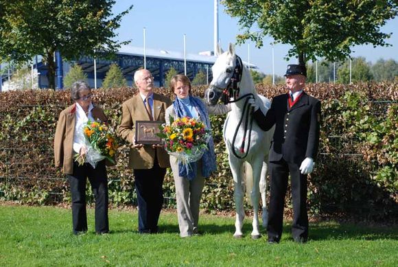 Bild: Von links: Züchterin Margherita Hospowsky und ihr Ehemann, Leiterin des Gestüts Marbach Dr. Astrid von Velsen-Zerweck, Pamir I und Hauptsattelmeister Horst Koenig Foto Susanne Bösche