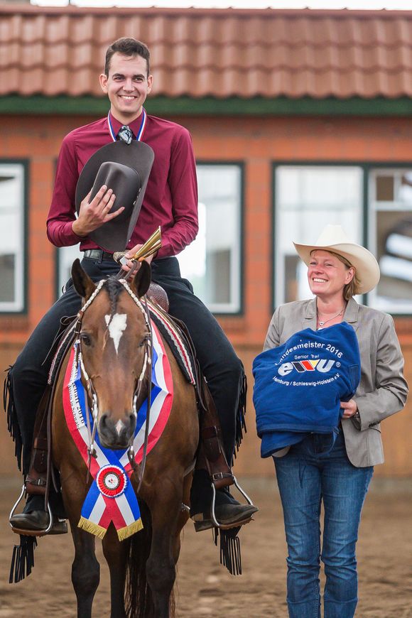 Hauke Themer ist schon früh zum Westernsport umgestiegen. „Ich fing an mit Dressur, bis ich mit elf Jahren durch eine Stute meiner Mutter das Westernreiten entdeckte.“ Gezieltes Training brachte ihn schnell auf Wettkampf-Niveau. „Mich faszinieren die Anforderungen an Mensch und Pferd und das ständige Lernen“, erzählt der heute 25-jährige, der in Kiel studiert. Mit Erfolg. Seit 2003 ist er pausenlos auf Turnieren unterwegs, seit 2007 mit seinem Erfolgspferd Loubega, seit 2010 im Landeskader der Erwachsenen. Es folgten die Landesmeistertitel in 2012, 13 und 16. Dazu kamen bundesweite Top-Ten-Platzierungen sowie Manschaftsbronze in 2012. Viel bedeutet ihm auch der Titel des EWU Champion 2014 in der Western Horsemanship.