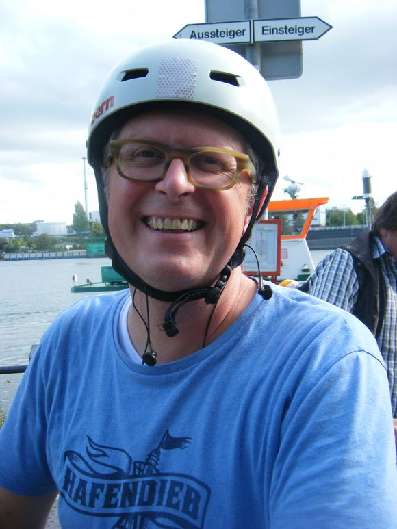 Bild: „Transport, Fitness und Hobby“: Diese drei Funktionen hat das Fahrrad für Martin Müller, erzählt der Friedrichsorter Ingenieur, während er das Rad von der Rampe der Kanalfähre gen Feierabend heraufrollt.