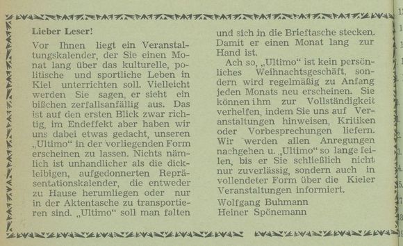 Stadtmagazine als Inspirationsquelle fĂŒr mobile, aktive und erlebnishungrige Menschen gehören heute zu jeder gröĂeren Stadt - in bewusster ErgĂ€nzung zur Tageszeitung. Das erste deutsche Stadtmagazin ultimo wurde bereits 1968 In Kiel von den Studenten Wolfgang Buhmann und G. Heiner Spönemann gegrĂŒndet. Nach gemeinsamen SchĂŒlerzeitungszeiten verabredeten sie in der legendĂ€ren Szenekneipe âclub 68â (in der RingstraĂe 68) einen Veranstaltungskalender fĂŒr die Stadt, finanziert aus Anzeigen, zur kostenlosen Abgabe in einer Startauflage von 3000 Exemplaren zu produzieren. Im handlichen Format DIN A 5 umfasste die erste Ausgabe im Dezember 1968 lediglich sechs Seiten. Bei der monatlichen Erscheinungsweise bot sich der Name âultimoâ einfach an.
