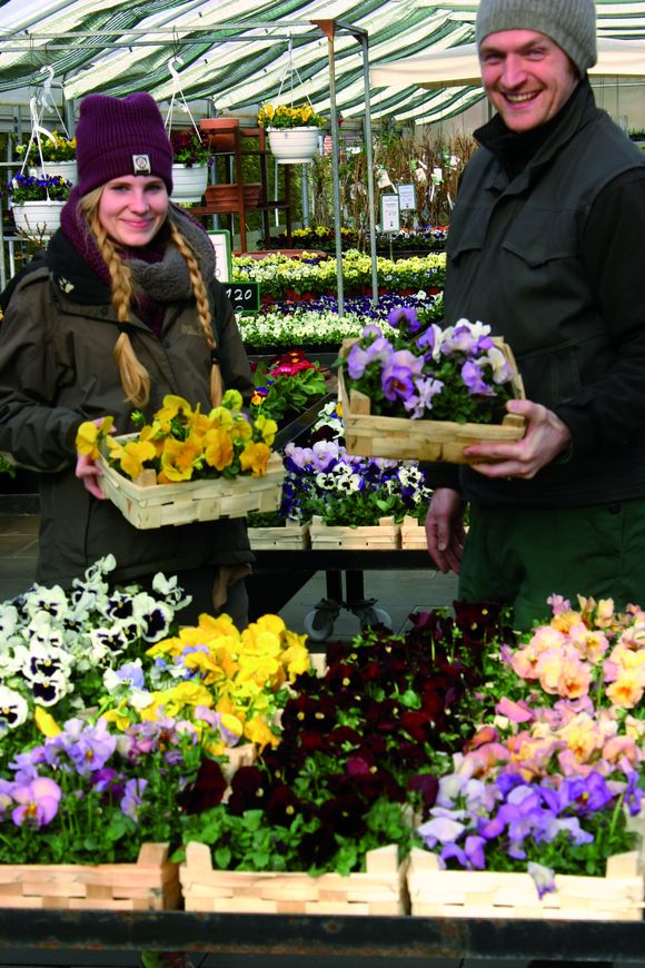 Bild: Blumig bunt: Gärtnereichef Fridolin Klemm und Praktikantin Jasmin Störcker stehen zwischen den Stiefmütterchen.