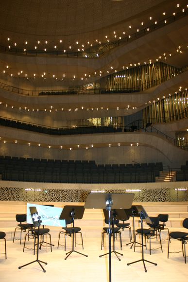 Für die Akustik zeichnet der Japaner Yasuhisa Toyota verantwortlich, der auch die Suntory Hall in Tokyo und die Walt Disney Hall in Los Angeles mit bauen half. 10.000 gekrümmte Platten aus Gipsfaser an den Wänden reflektieren den Schall zurück in den Konzertsaal. Alle Ränge sind terrassenartig um die Bühne angelegt, sodass keiner der 2100 Gäste weiter als 30 Meter vom Dirigenten entfernt sitzt. Das 100-köpfige Symphonie-Orchester des Norddeutschen Rundfunks hat bereits sein neues Zuhause backstage bezogen und probt für eine Konzertserie im nächsten Jahr.