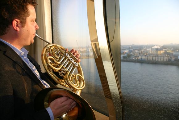 Bild: Den sieben NDR-Hornisten – darunter Dave Claessen – ist ein kleiner Übungsraum mit Seeblick zugedacht.